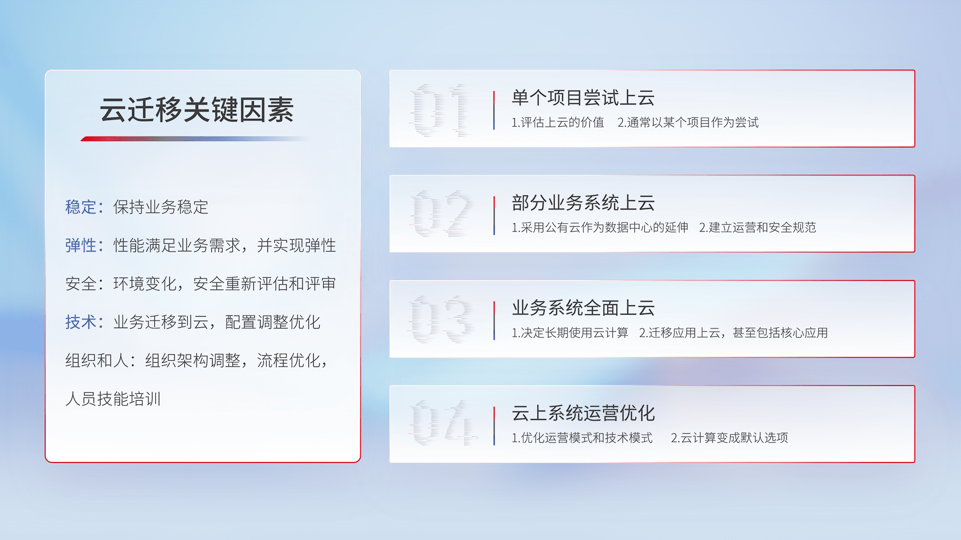 结合实际业务,,,从规划设计、、、、云平台选型、、云原生改造、、数据迁移、、、、集成交付,,,,迁移全过程为客户识别最佳上云路径,,做好风险识别管理,,,设计网络架构、、、身份权限、、安全审计合规、、、操作审计、、日志审计、、监控告警策略、、多站点容灾设计等,,,对云上基础设施进行整体规划,,提升IT治理水平,,,,以满足弹性、、、高可用、、、、高性能的需求。。