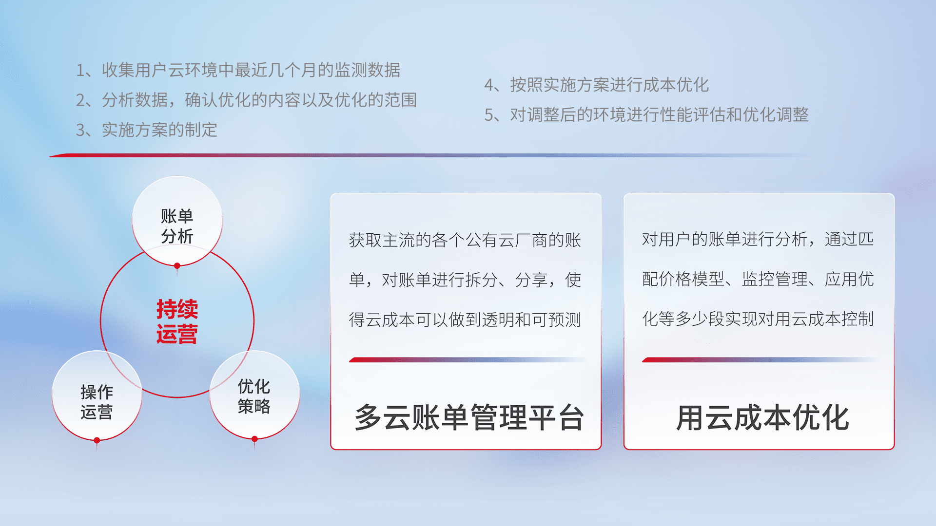 通过多云纳管,,,以统一的资源数据模型把客户的云资源进行抽象和封装,,,,进而实现对多云资源的统一操作,,保障云资源管理的可靠性、、、稳定性与可用性。。量身定制化运维内容,,,,配置、、、开发运维、、补丁管理、、备份、、、监控、、、认证和访问管理、、、、审计和日常巡检等,,,保障在用云过程中的可靠度,,,,稳定度以及高可用率。。。。